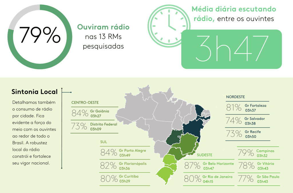 De acordo com a pesquisa Data Stories Inside Audio 2025, produzida pela Kantar IBOPE Media, o rádio ainda alcança 79% da população nas 13 principais regiões metropolitanas, com uma média de quase 4 horas de escuta diária. O rádio continua sendo um dos meios de comunicação mais presentes e influentes na vida dos brasileiros. Cerca de 70% dos conteúdos produzidos pelas emissoras de rádio são consumidos diretamente no formato AM/FM, mostrando que o rádio ainda desempenha um papel significativo na maneira como as pessoas se informam e se divertem.